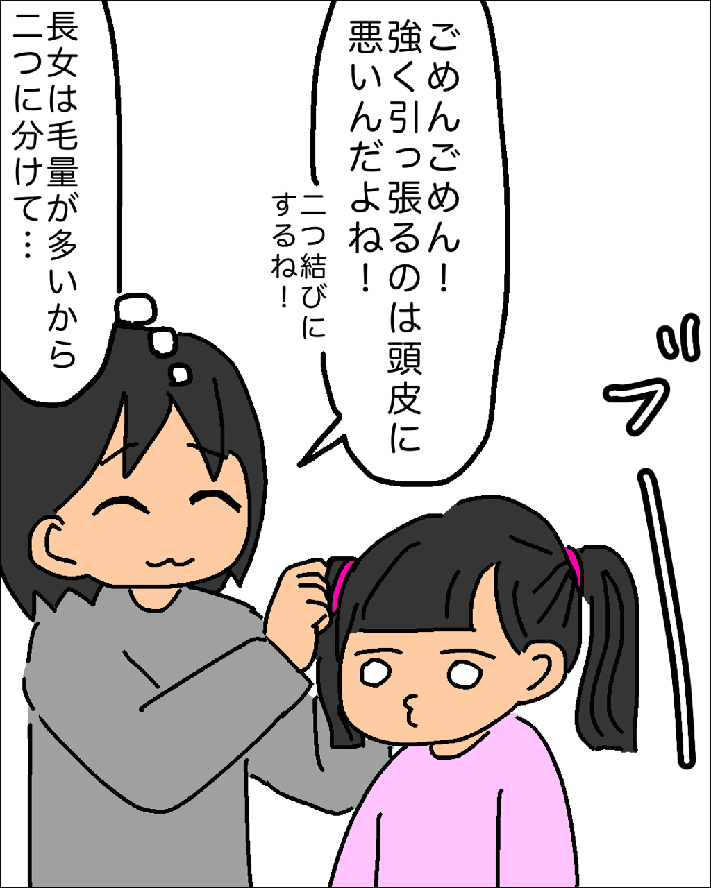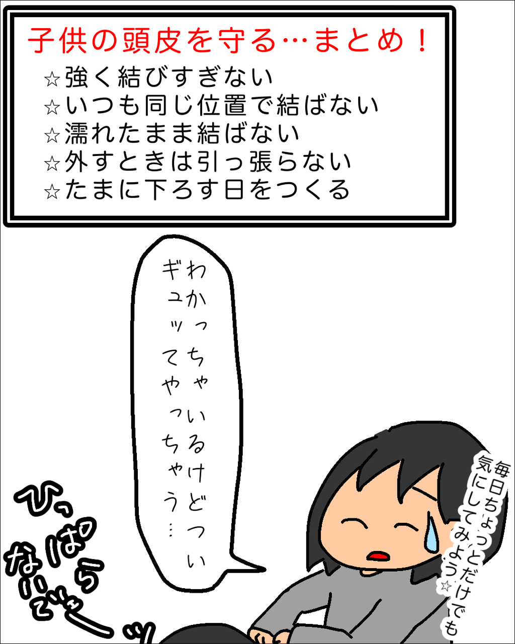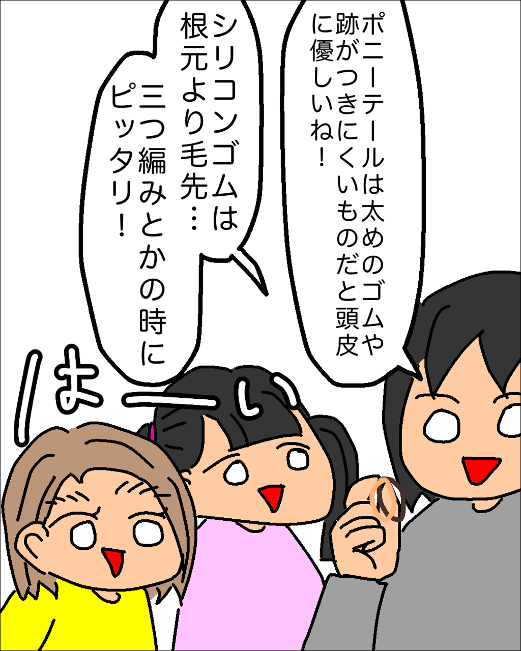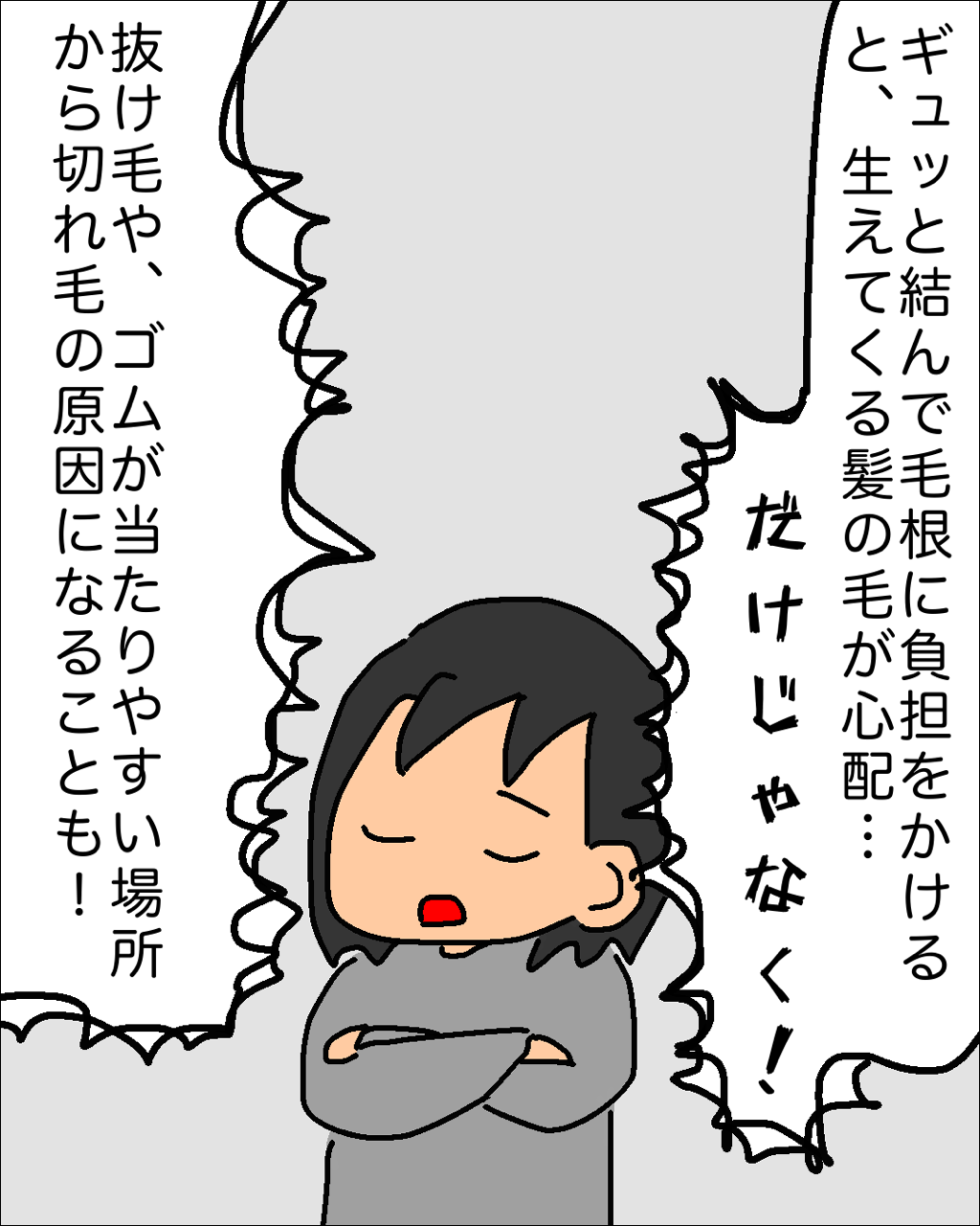細くて伸びないゴムは、頭皮近くで使うとテンションが集中します